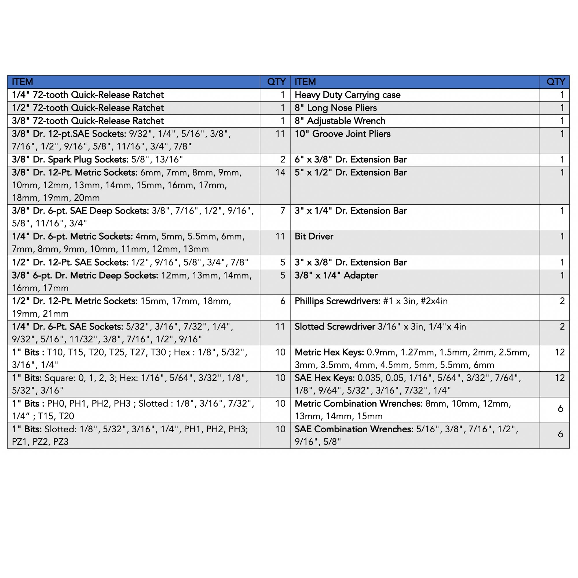 SOCKETS, WRENCHES & MORE: Contains the most needed mechanics tools and the most popular sizes of SAE and metric sockets including spark plug sockets and deep sockets, several sizes extension bars, 40 screwdriver bits, and SAE and metric hex keys. 3 sizes 72-tooth ratchet handles, groove joint pliers, long nose pliers, and adjustable pliers will meet most needs during repairs and maintenance.