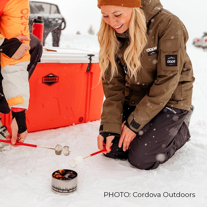 It comes in a small tin that is filled with wax that you just need to start with a torch lighter, and it will build all on its own into a large bonfire that you can sit around wherever you are!